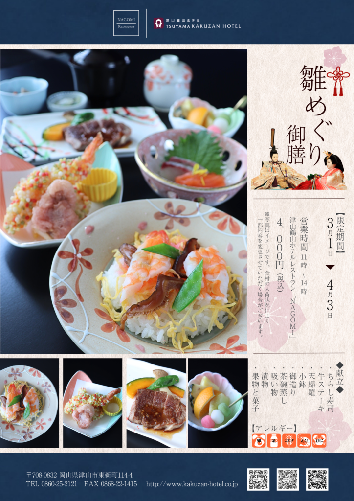 津山鶴山ホテル 1階 レストラン 和 ~NAGOMI~では、3/1~4/3限定でお楽しみいただける雛めぐり御膳をご用意しております。